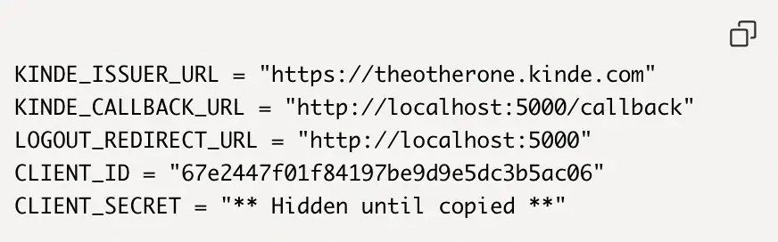5. To add Kinde authentication to them, set up a config.py file with the following base template information: